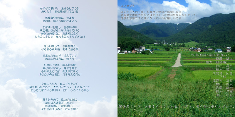 Y.サイトウ ,Yuuta,Saito, 2007 / 作品URL / 登録:2007-08-04 00:13:22, #327 バラード Ballad, 総DL数 5678, コメント数 1概要: 隔てた二人の「夏」を舞台に物語が展開します。老若男女誰にでも当てはまりそうな雰囲気を目指しました。情景を想像できる曲になっていれば嬉しいです。
